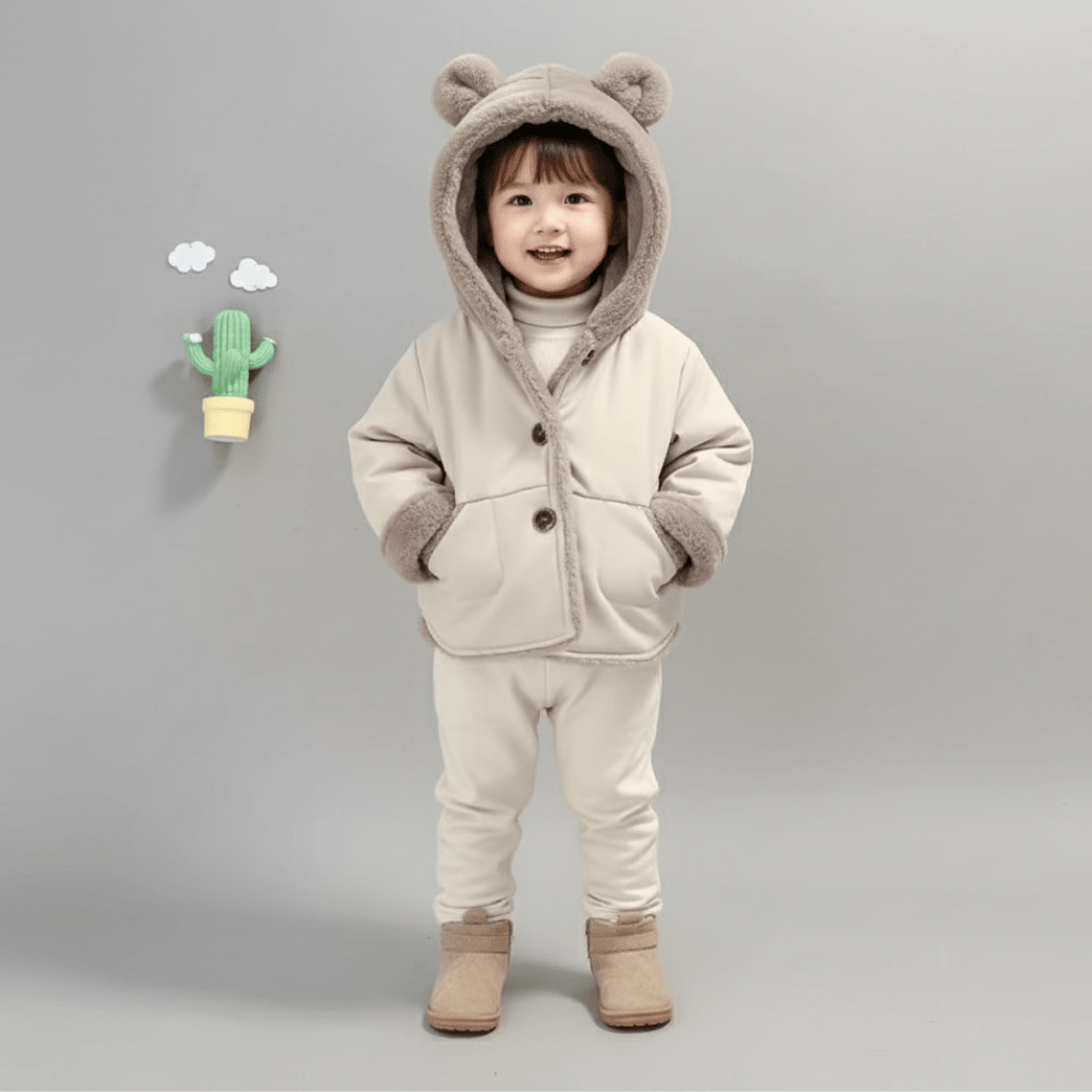 Ge ditt barn en varm och mysig höst och vinter med denna fleecefodrade babyjacka. Den är designad i unisex-stil med en mjuk huva försedd med söta björnöron, vilket gör den både praktisk och charmig. Perfekt för kyliga höst- och vinterdagar.