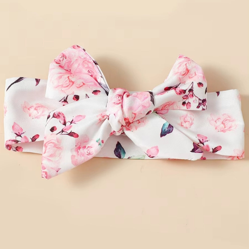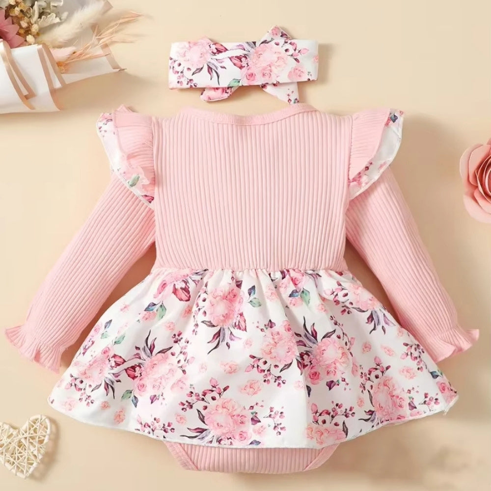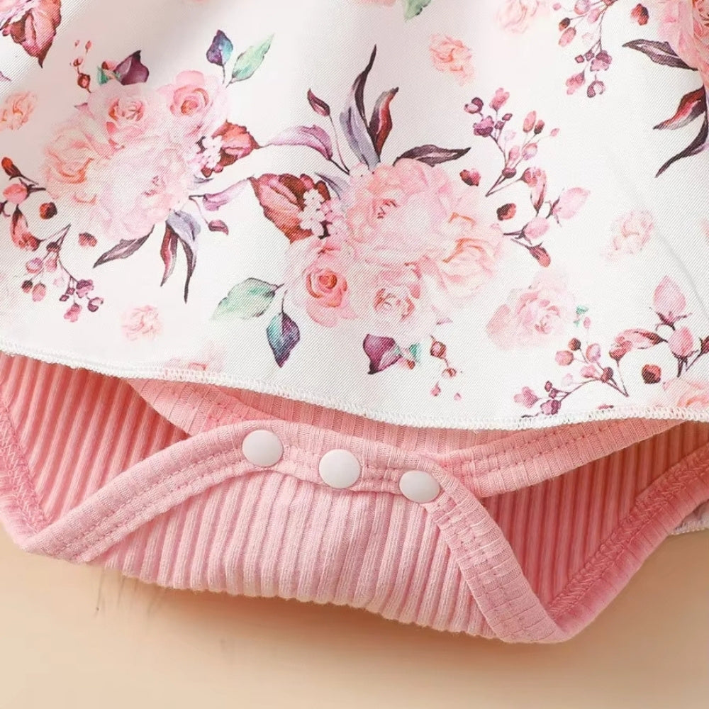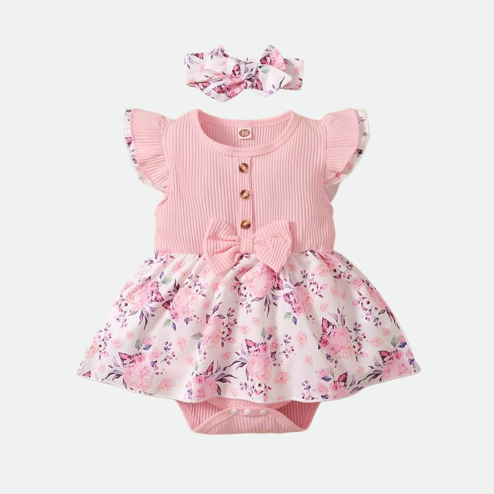 En söt tvådelad outfit som kombinerar komforten i en romper med utseendet av en klänning. Den ribbade bodyn har fjärilsärmar, dekorativa träknappar och en stor rosett i midjan. Kjoldelen i mjuk chiffong med somrigt blommönster ger en luftig känsla, medan tryckknappar i grenen gör blöjbytena snabba och enkla. Setet levereras med matchande hårband som knyts till rosett – perfekt för kalas, fotograferingar och varma sommardagar.