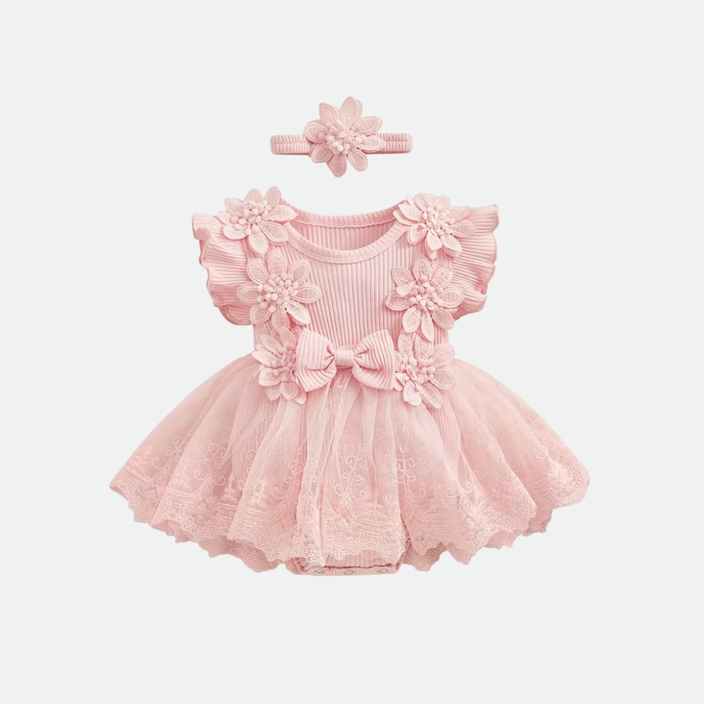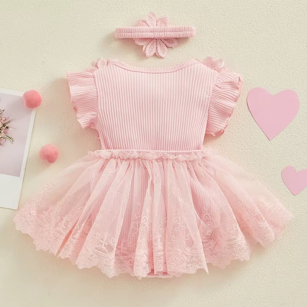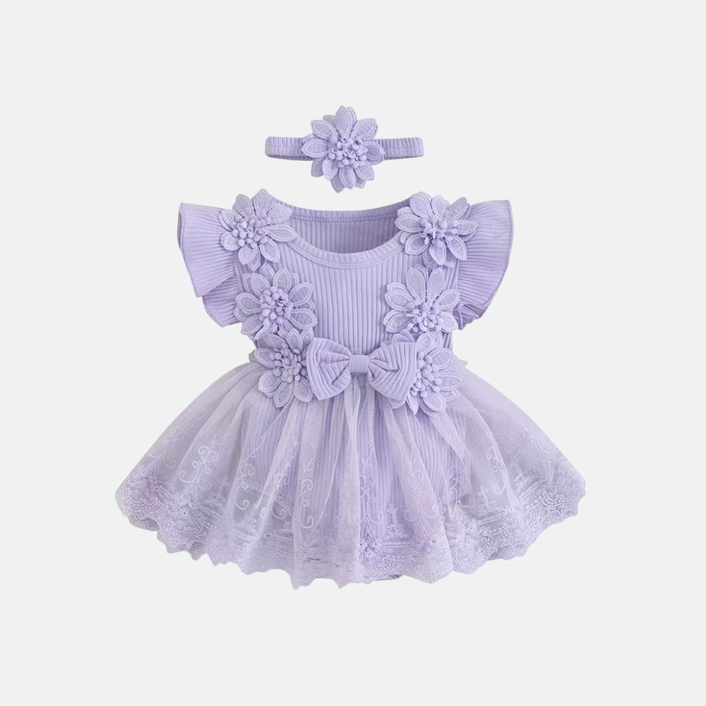 Gör varje dag till en liten fest med denna romantiska romperklänning i spets och tyll. Den ribbade bomullstoppen är dekorerad med 3D-blommor och volangärmar, medan den broderade tyllkjolen ger extra fyllighet. Tryckknappar i grenen gör blöjbyten enkla, och det matchande elastiska hårbandet fulländar looken. Välj mellan mjuk rosa eller drömmigt lila – perfekt för fotograferingar, dop eller sommarens kalas.