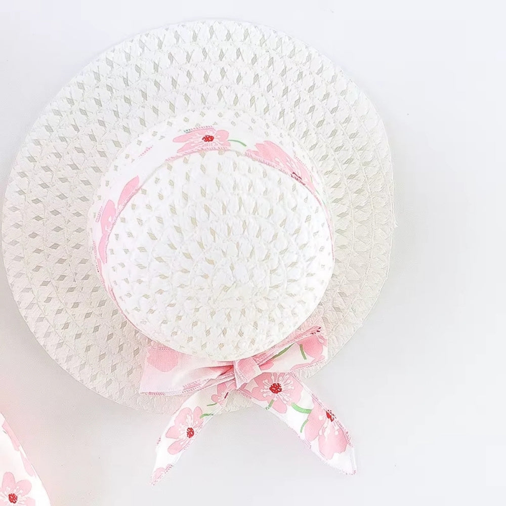 Denna luftiga klänning i bomullsblandning är gjord för soliga dagar på stranden eller i trädgården. De justerbara hängslena och den vida kjolen ger maximal rörelsefrihet, medan den stora rosetten framtill sätter pricken över i:et. Ett matchande, ventilerande stråhatt med dekorativt band ingår – perfekt för att skydda små ansikten från solen.